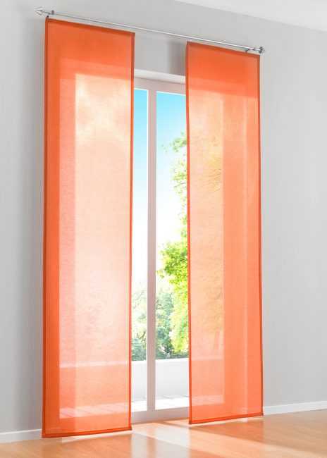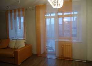Идеальным вариантом для оформления окна с балконной дверью признанно считаются японские шторы. Они состоят из двух и более полотен, передвигающихся в вертикальной плоскости, и в закрытом положении занимающих всю стену. При необходимости открыть дверь на балкон, одно из полотен просто сдвигается в сторону.
