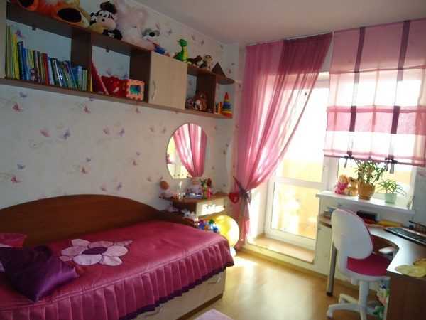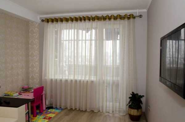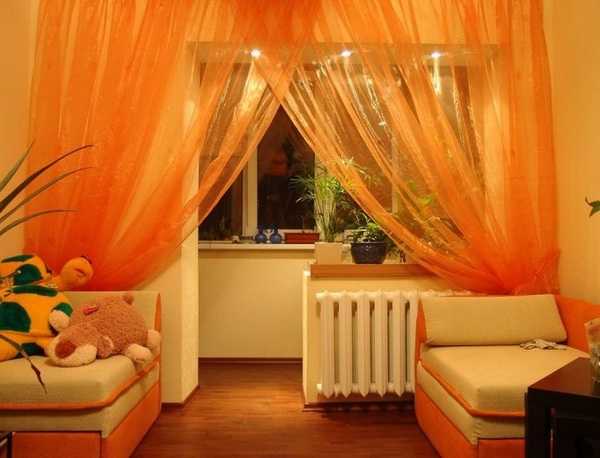 Если балкон, выход на который находится в зале, застеклён и занавешен, окно комнаты можно украсить одним тюлем из органзы или вуали. Это позволит красиво оформить проём, не затемнив помещение.