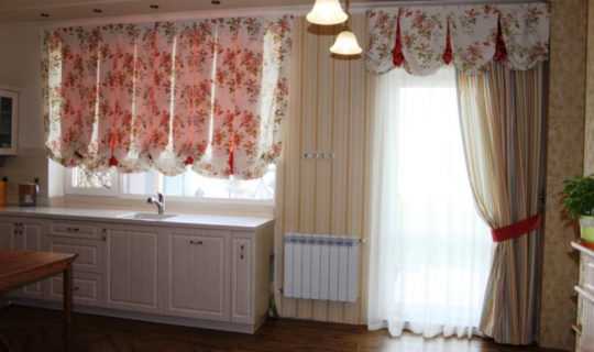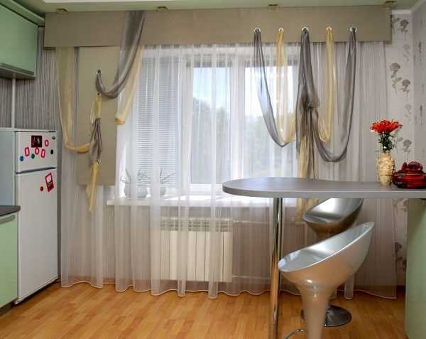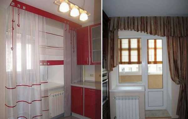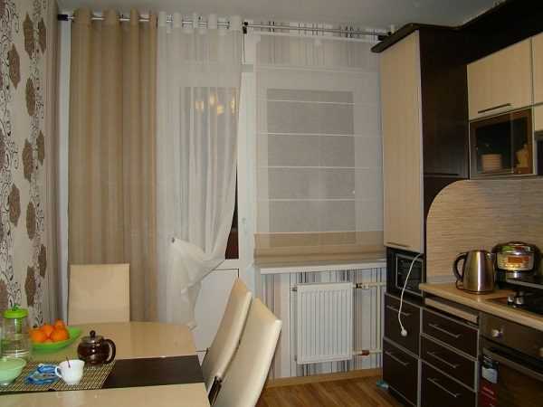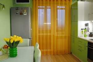 Совет: Текстильное полотнище не должно препятствовать доступу к двери, а потому массивные ламбрекены, портьеры из плотной тяжелой ткани, многослойные или объемные драпировки сразу же исключаются из списка возможных вариантов штор для кухни с балконом.