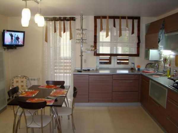 - Цвет может быть любым, в зависимости от вкуса владельца, однако дизайнеры советуют гармонировать оттенок занавесок с фасадами мебели.