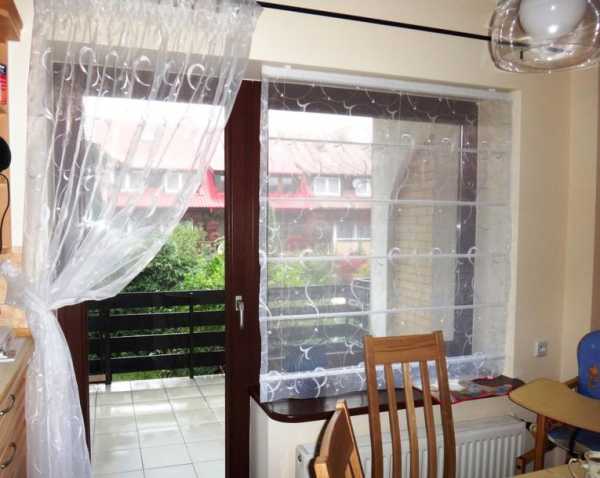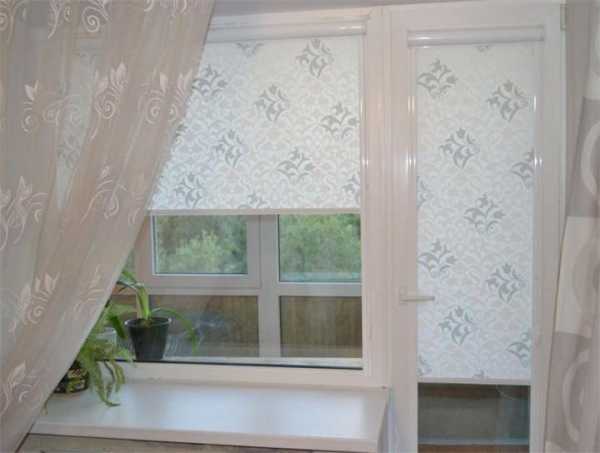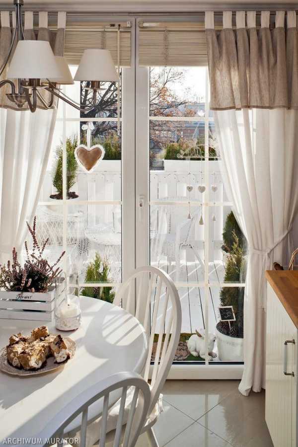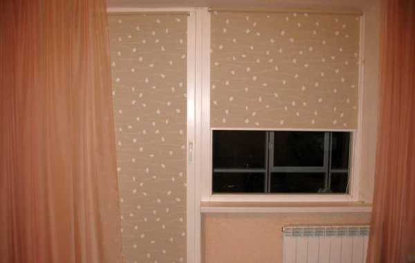 Совет. Чтобы скрасить строгость рулонных штор, проем декорируется прозрачными занавесками длиной до подоконника. Они могут быть разного покроя: по диагонали, в виде арки, со свисающими углами. Крой занавесок нужно продумать так, чтобы они не мешали открывать дверь и держать ее в открытом положении.