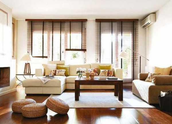 Вертикальные, горизонтальные жалюзи из различных материалов и рулонные шторы лаконичны, занимают минимум полезного пространства, не перегружая интерьер зала, и очень просты в уходе. Несомненно, они соответствуют все предъявляемым к декору совмещенного с выходом на балкон окна требованиям: