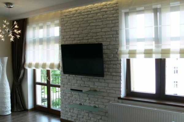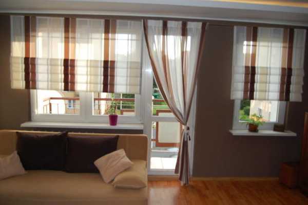 Оформляя выход на балкон римскими шторами, используется два полотна – одно для окна, а второе для двери. Минус римских штор в том, что их нельзя отклонить в сторону, чтобы выглянуть в окно, а также открыть дверь на балкон можно только после того, как шторка будет собрана, иначе она будет мешать.