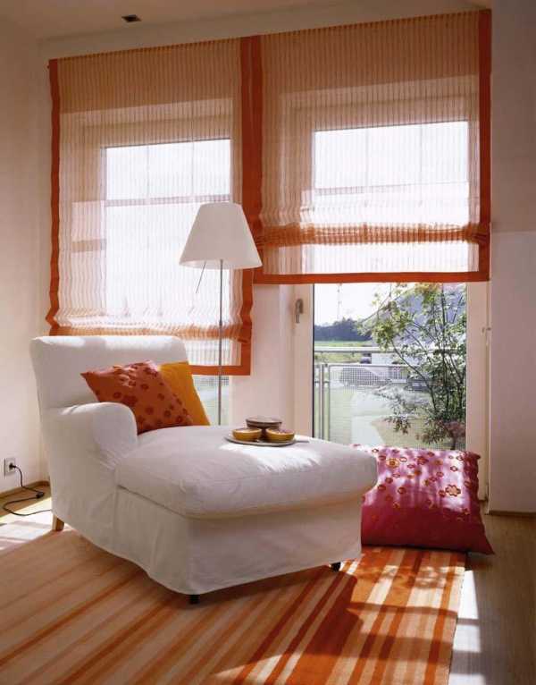 Выбор расцветки целиком зависит от стиля помещения и пожелания владельца, но следует помнить – темные занавески не стоит использовать в небольших по габаритам комнатах, они сделают помещение еще меньше. Римские шторы на балконную дверь – очень удобный вариант, их легко поднимать и опускать при необходимости.