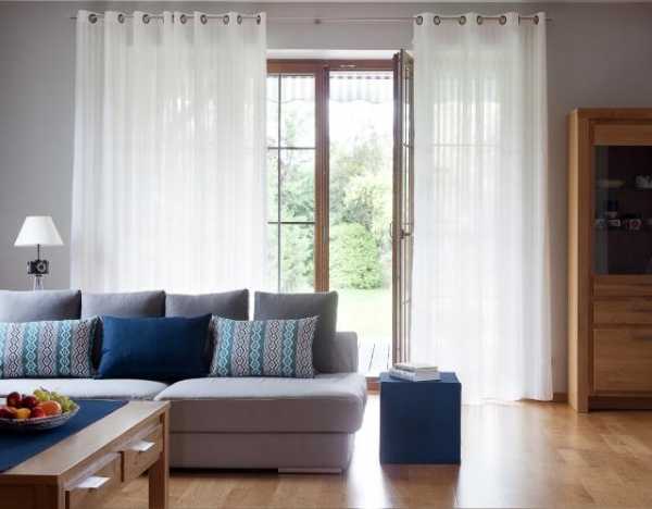 В качестве крепления лёгких штор стоит выбрать пластиковые или металлические люверсы: если дверь будет нужно открыть максимально широко, вы сможете без проблем сдвинуть тюль. Главное – цвет тюля должен гармонировать с интерьером комнаты: отдавать предпочтение белоснежному материалу вовсе необязательно!