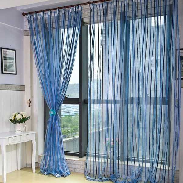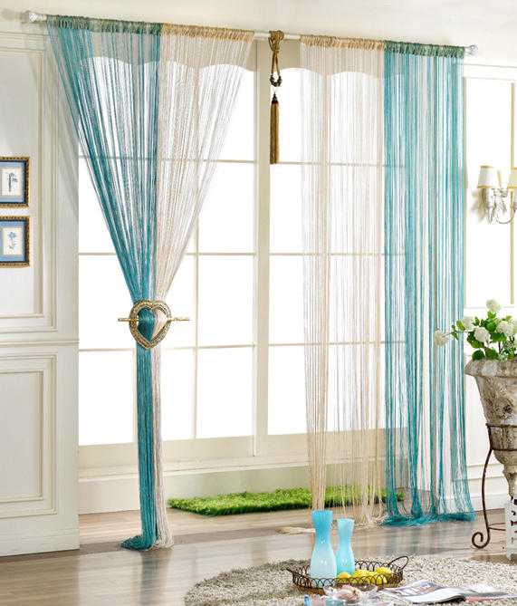 Новинка в мире штор – нитяные занавески. Они представляют собой нити, закрепленные на плотной тканевой полосе. Изготавливаются разного цвета, бывают с рисунком, с нитями разной толщины, могут быть украшены стеклярусом, бусинами и другим декором. Кроме декоративности, нитяные шторы обладаю еще одним преимуществом – сквозь них можно пройти в любом месте, просто раздвинув нити руками, и они снова вернутся в исходное положение. Выходя на балкон, не нужно сдвигать занавеску по карнизу.