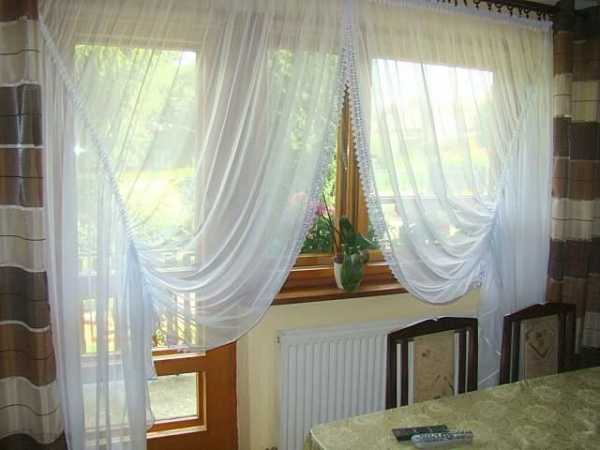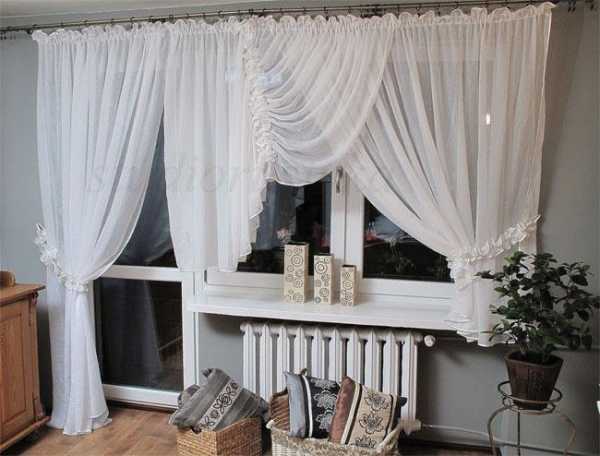 На фото двухцветная кисея, которая красиво обрамляет окно в зале.