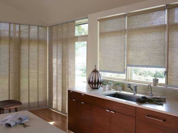 - Хорошо смотрится дуэт римских штор и японских панелей, выполненных из гармонирующих материалов.