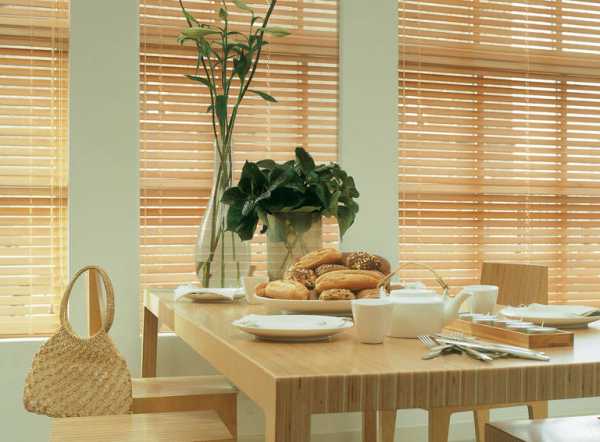 Дерево. Деревянные жалюзи придадут шарм помещению в классическом стиле, кантри или эко. К разновидности деревянных жалюзи относятся более распространенные бамбуковые модели. Бамбук влагоустойчив и экологичен, легок и компактен, обладает антистатическим эффектом. Самой природой он защищен от выгорания. А для ухода за ним достаточно просто протереть салфеткой по поверхности.