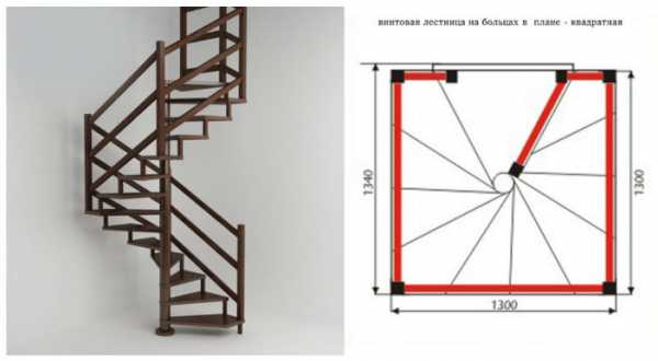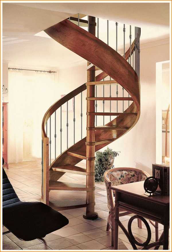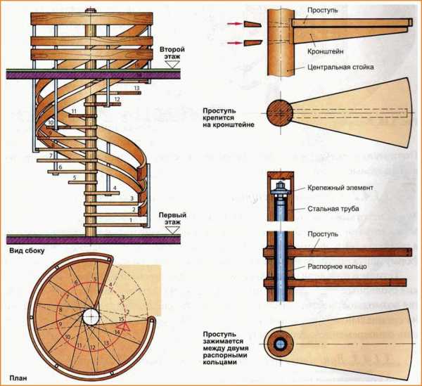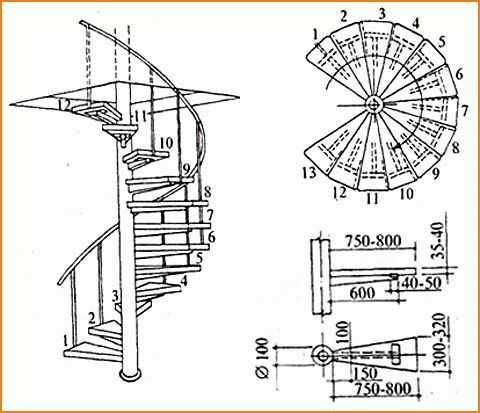 Наиболее простой в изготовлении является винтовая лестница на больцах с центральным опорным столбом. Поэтому мы сосредоточим свое внимание именно на этой конструкции.