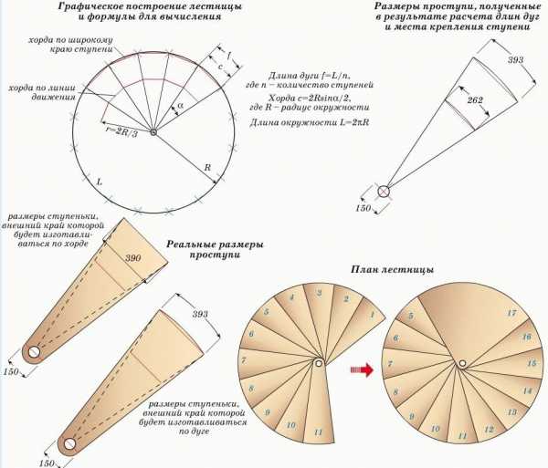 Если вы делаете лестницу с углом поворота в 180 градусов, то полученную длину окружности необходимо умножить на ? или, проще говоря, разделить на 2. Если же лестница делает полный оборот в 360 градусов, то никаких дополнительных действий не производится.