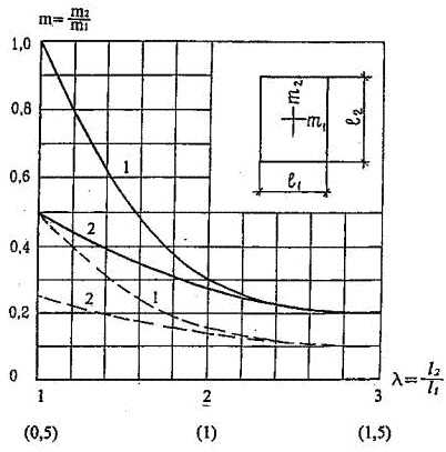 Существующие экспериментальные данные и опыт, полученный при проектировании, показывают, что при соотношении λ = l2 / l1 > 3 показатель поперечного момента окажется в 5 раз меньше продольного. А в случае когда λ ≤ 3, определить соотношение моментов допустимо, используя эмпирический график, который проиллюстрирован на ИЗОБРАЖЕНИИ 7, где можно проследить зависимость моментов от λ. Под единицей подразумеваются плиты монолитного типа с контурным шарнирным опиранием, двойка предполагает плиты с трехсторонним шарнирным опиранием. График изображает пунктир, который показывает допустимые нижние пределы в процессе подбора арматуры, а в скобках указаны значения λ, что применимо для плит с трехсторонним опиранием. При этом λ < 0,5 m = λ, нижние пределы m = λ/2. Но в этом случае интерес представляет лишь кривая №1, которая отображает теоретические значения. На ней можно видеть подтверждение предположения, что уровень соотношения моментов равен 1 для плиты квадратной формы, по ней можно определить уровень моментов для остальных соотношений ширины и длины.