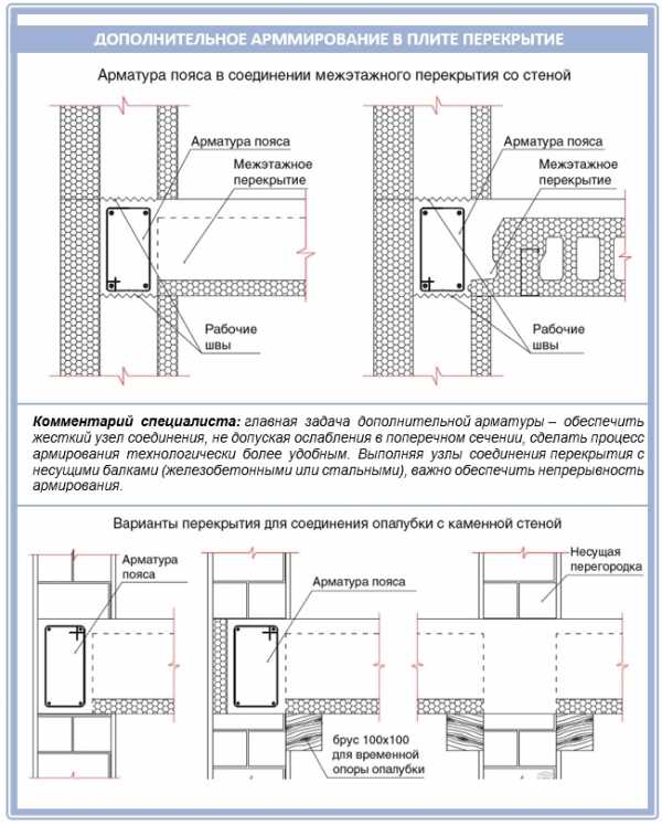 В зависимости от площади заливки проводится дополнительное усиление. Оно делается отдельными отрезками арматуры длиной 40-200 см. Нижнюю сетку надо усилить в проеме, верхнюю – над несущими стенами. В местах опирания на колоны армирование требует отдельных объемных усиливающих элементов.