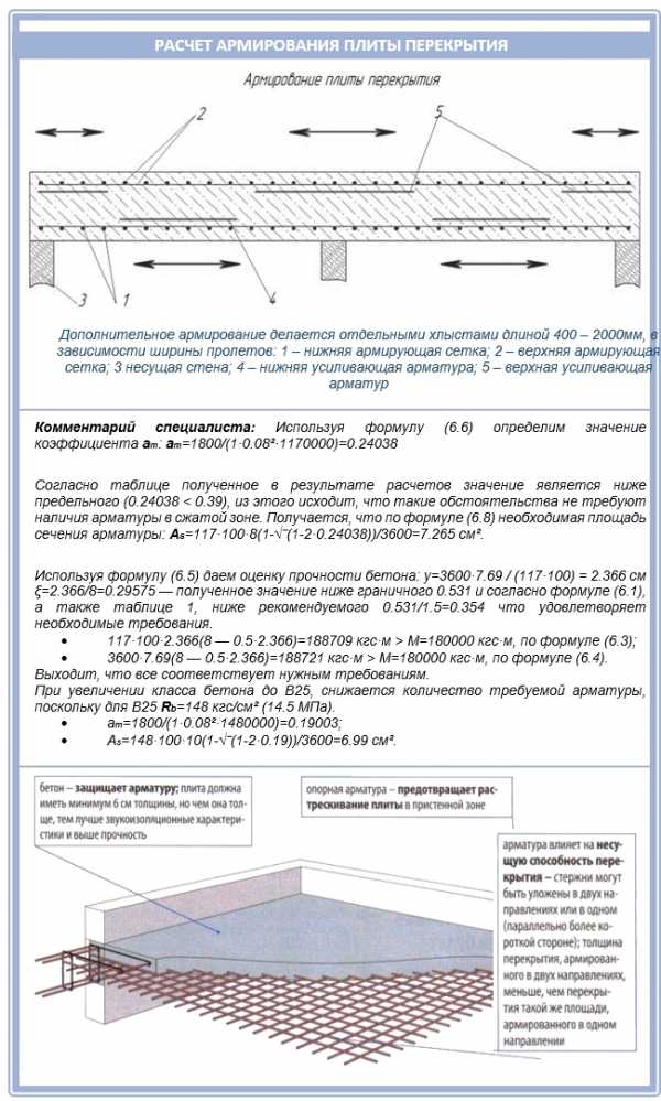 При расчете монолитной плиты перекрытия всегда учитывается и класс бетона, и класс арматуры. Само сопротивление бетона принимается всегда на значение, на какое идет сопротивление арматуры. Т.е., по сути, на растяжение работает именно арматура. Сразу оговоримся, что здесь существует несколько расчетных схем, которые учитывают разные факторы. Например, силы, которые определяют основные параметры поперечного сечения по формулам, или расчет относительно центра тяжести сечения.
