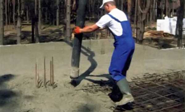 Для заливки перекрытий используют бетон марки М400 (1 часть бетон, 2 – песок, щебень -4, вода). Бетон заливают в опалубку, начав в одном углу, и закончив в противоположном. При укладке нужно использовать глубинный вибратор, это поможет удалить пустоты с бетона. Железобетонная плита заливается без перерывов, толщиной в 8-12 см. После заливки поверхность выравнивается устройствами, похожими на швабры.