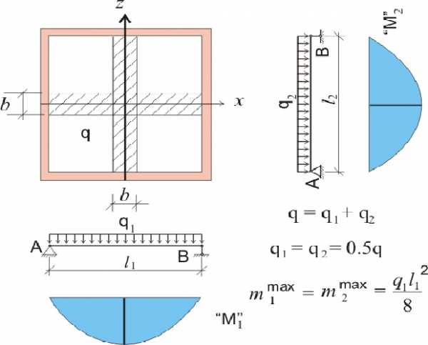 Как известно, изгибающий момент по отношению к оси абсцисс балки с опорой на две стены, имеющей пролет ln вычисляют по формуле mn = qnln2/8 (для удобства за ее ширину принят 1 м). Очевидно, что если пролеты равны, то равны и моменты.