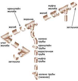 Одновременно с определением количества муфт соединения нужно узнать число кронштейнов, углов поворота, водосливных воронок и метизов для фиксации элементов.