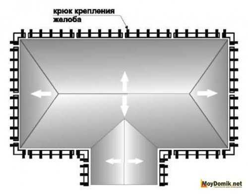 Практический совет. Во время определения размеров кровли следует суммировать площадь всех скатов, с которых вода попадает в желоб, в том числе и со сливов в ендовах.