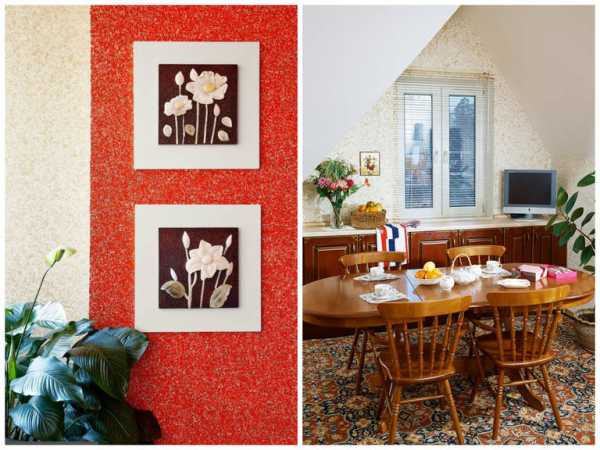 Жидкие обои можно сочетать с разнообразными вариантами отделочных материалов