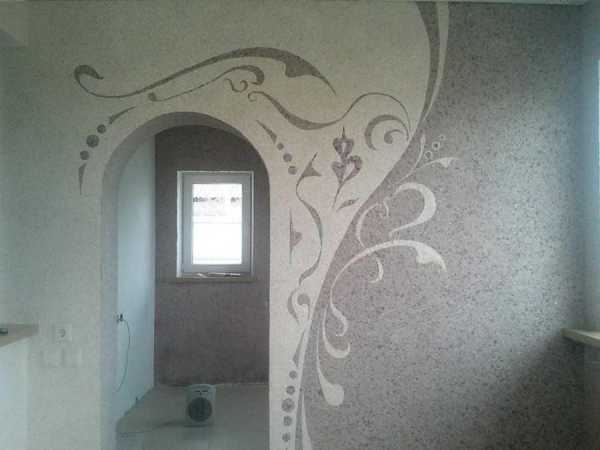 - узоры из разноцветных жидких обоев. При этом стена полностью оформляется такой отделкой, но в процессе используются разноцветные смеси. Предварительно на прогрунтованной поверхности рисуют с помощью трафарета нужный узор, а затем наносят обои в соответствии с декором.