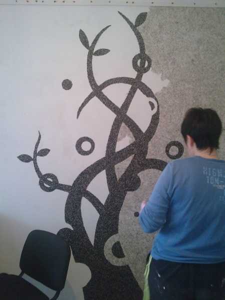 Декоративные изыски. Жидкие обои — отличный инструмент для создания панно на стене. Сначала на подготовленную стену наносится контур. На нужных участках наносится масса одного цвета, ей дают высохнуть (около суток), и только после этого наносят массу другого цвета на соседние участки. Во избежание смешивания цветов высохшие участки заклеивают малярной лентой: это позволяет достичь идеально очерченного резкого контура.
