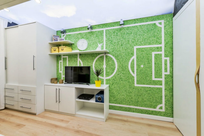 В этом случае вам не обязательно обладать художественными навыками, достаточно продумать, какие из стен или их участки вы оформите иначе, чем основную площадь. Например, углубления для картин или дивана, могут быть «оклеены» жидкими обоями с использованием мелкой структуры. Это может быть флок или состав с эффектом шелка.