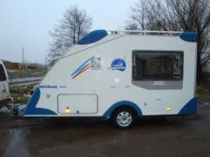 Модель оснащена двумя боковыми дверями в передней части. Сзади находится встроенная кухонька с раковиной, газовой плитой на пропане, небольшим баком воды. В передней части, рядом с крюком крепления и стабилизирующей ногой, раскинулся небольшой 12V аккумулятор, а также запасное колеса. Аккумулятор питает встроенные осветительные приборы на фасаде и в интерьера, и задние фары.