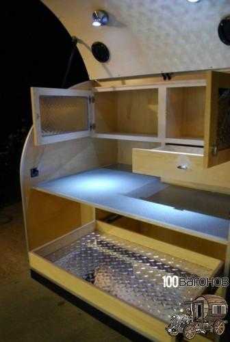 Первый жилой прицеп обладает компактными габаритами и обтекаемой формой. Все это облачено в оцинкованный корпус. Внутри все сделано из древесины, как и каркас. Если заострить внимание на интерьере, то он без излишеств. Кровать двуспальная, а сразу над ногами раскинулись небольшие ящики для хранения вещей и всякого-рода мелочевки.