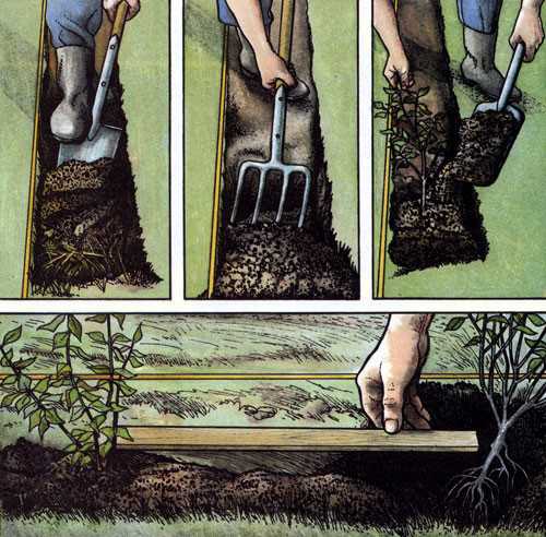 Для того чтобы кусты образовали действительно стену, участок перед посадкой саженцев нужно тщательно разметить. После этого по линии расположения будущей изгороди надо натянут верёвки. Вдоль них выкапывается траншея в 50 см шириной и в 65 см глубиной. Ее длина определяется только желанием и возможностями садовода.