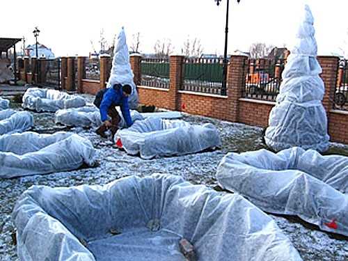 Затем с наступлением устойчивых морозов до -10 °С начинают мероприятия по защищающему затенению насаждений. Для укрытия шаровидных форм используют пластмассовые или деревянные ящики с отверстиями. Штамбовые деревца, предварительно подвязав к опорам, полностью обвязывают лапником или укрывным материалом. Если одревесневшие штамбы побелить, как плодовые деревья, тогда их можно не укрывать.