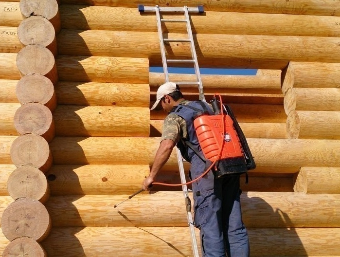 Для увеличения срока службы дома или бани из бревна или бруса при их строительстве все пиломатериалы обычно обрабатываются огнезащитными антисептиками или пропитками от плесени, грибка и жука древоточца.