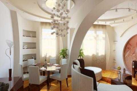 с помощью потолка – используя разный материал при отделке потолка, таким образом, можно произвести зонирование гостиной за счет изменения цвета, кроме этого, если навесить полукруглые гипсокартонные каркасы, то угловатость квартиры сглаживается, а комнаты при подобном зонировании отделяются друг от друга легко и невесомо;