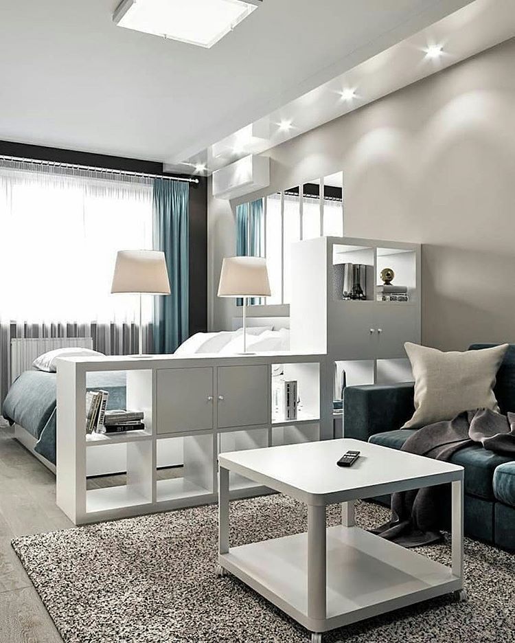 - Мебель. Кухня обычно завязана на коммуникации и перенос ее в другое место – не самое выгодное решение. Как расставить мебель в остальной части квартиры? Спальня-гостиная может быть отделена функциональной барной стойкой (она же будет служить и столом) или стеллажом, который будет выступать в роли дополнительного места хранения. Напротив кровати, которую следует поставить вплотную к стене, останется свободное место для телевизора или рабочего стола.