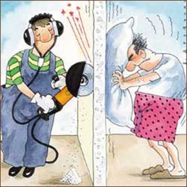 - Шум из смежных квартир – поступает через стены, сквозные розетки и щели между плитами перекрытия. Шум от соседей, является самой частой причиной желания произвести звукоизоляцию квартиры. Если источник постоянного раздражающего шума один, то достаточно произвести звукоизоляцию смежных с источником стен. Если же вам не повезло, и шумные соседи окружают вас со всех сторон, то в этом случаи, придётся делать полную звукоизоляцию квартиры.